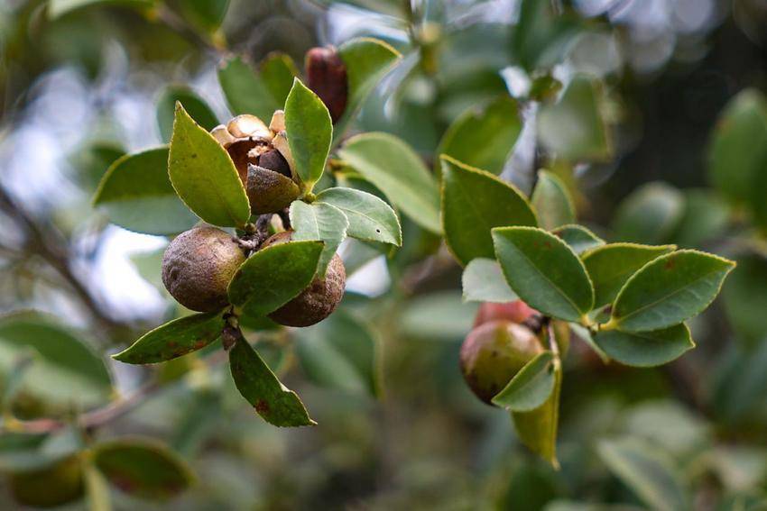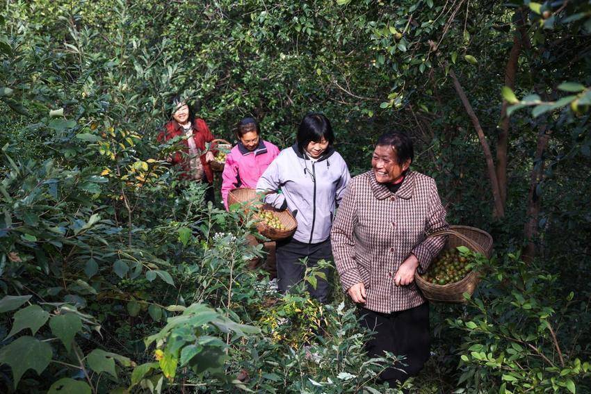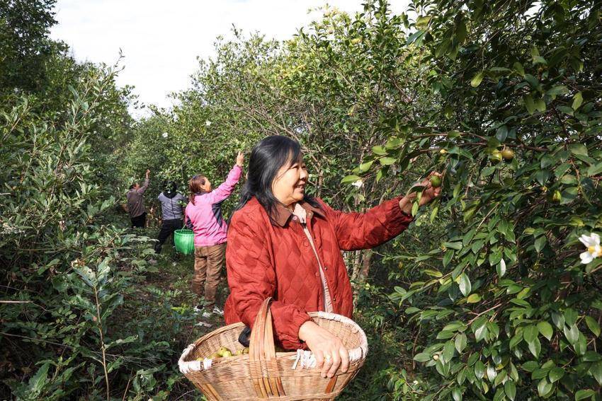 走进油茶基地,漫山洁白的油茶花竞相绽放,饱满浑圆的油茶果已压弯枝头,形成了“花果同期”的独特景观。村民李大芳手提竹篓,手法娴熟地摘下一颗颗成熟的茶果。“我们都是附近的村民,合作社统一提供技术指导和管理,不仅方便照顾家里,在这采摘期里,一个月还能有4000元左右的收入。”她笑着介绍,这份家门口的工作带来了实实在在的收益。